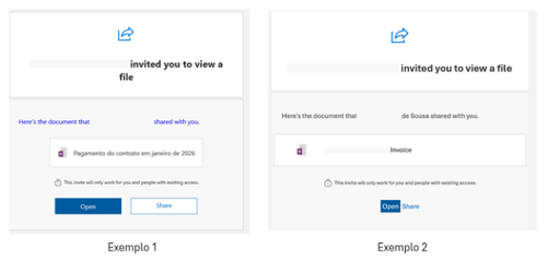 Ressaltamos que esse tipo de mensagem não representa, necessariamente, um compartilhamento legítimo, podendo direcionar o usuário para páginas fraudulentas, com risco de coleta de credenciais, comprometimento da conta institucional e sequestro de sessão, inclusive de autenticação multifator (MFA).