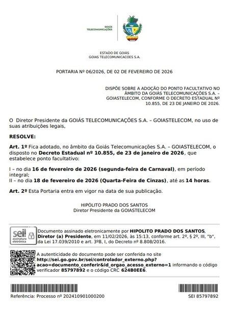 A GOIASTELECOM adotará ponto facultativo nos dias 16 e 18 de fevereiro de 2026, conforme estabelece a Portaria nº 06/2026, assinada pelo diretor-presidente Hipólito Prado dos Santos. A medida segue o disposto no Decreto Estadual nº 10.855, de 23 de janeiro de 2026, e alinha a empresa à orientação do Governo de Goiás para o período de Carnaval.